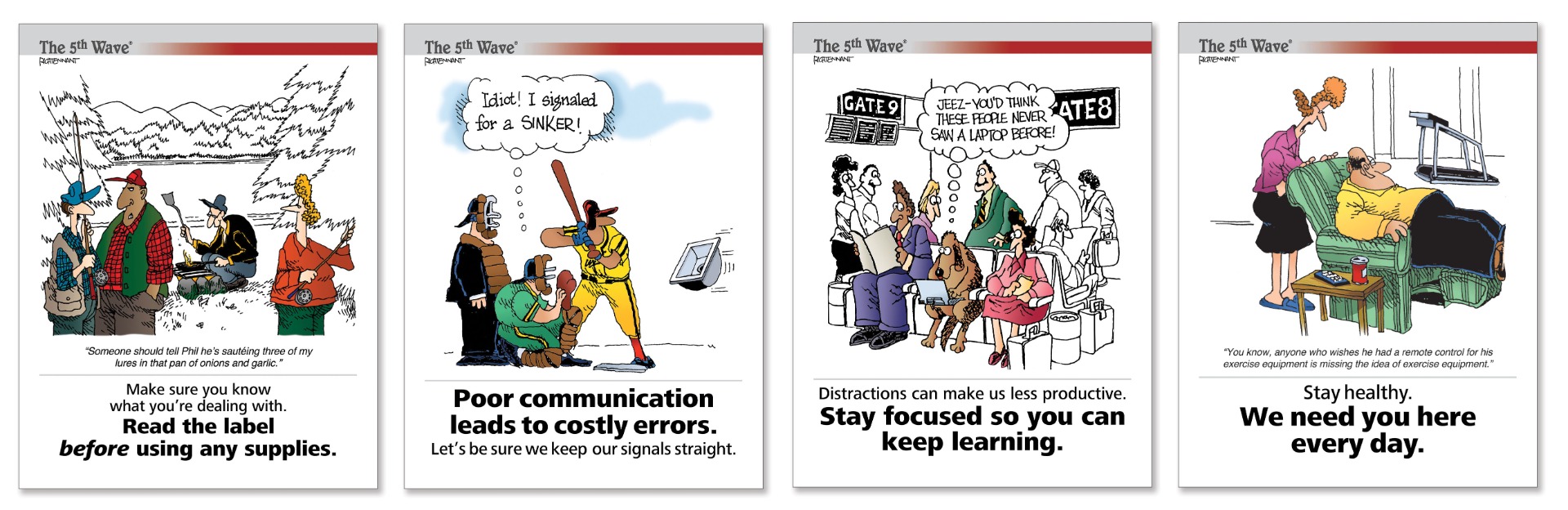 The 5th Wave Posters are a delightful but serious poster program that combines the hilarious humor of a popular, nationally syndicated cartoon,The 5th Wave, with motivational messages designed to create awareness for key company goals and increase employee performance. Every month, you'll receive a set of brand new 5th Wave Poster issues for display throughout your company on a weekly basis. You'll be amazed at how your employees stop to read a new poster each week. First, they'll read the cartoon and then they'll get the motivational message.